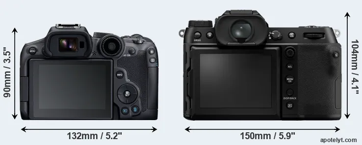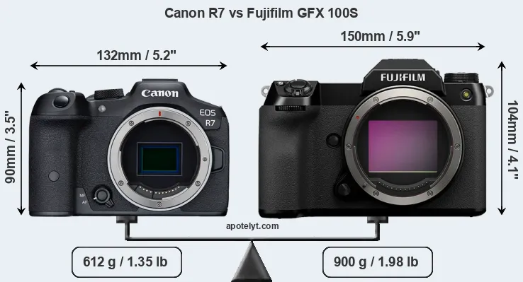 El tamaño físico y el peso de Canon R7 y Fujifilm GFX 100S se ilustran en el siguiente gráfico. Las dos cámaras se muestran según su tamaño relativo. Todas las dimensiones están redondeadas al milímetro más cercano.