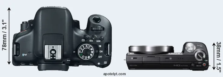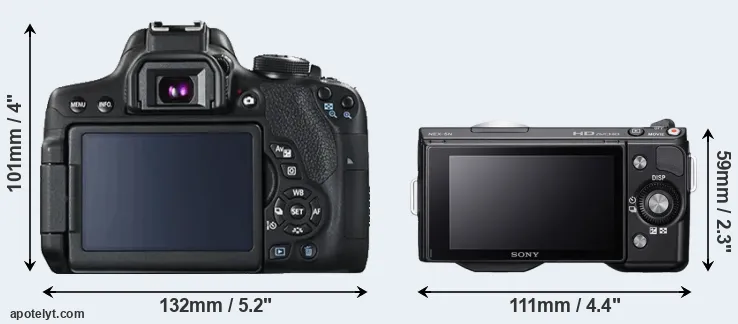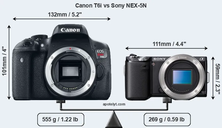 El tamaño físico y el peso de Canon T6i y Sony NEX-5N se ilustran en el siguiente gráfico. Las dos cámaras se muestran según su tamaño relativo. Todas las dimensiones están redondeadas al milímetro más cercano.