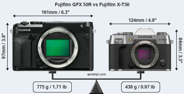 La Fujifilm GFX 50R y la Fujifilm X-T50 son dos cámaras digitales que fueron reveladas al público, respectivamente, en septiembre de 2018 y mayo de 2024. Ambas son cámaras cámara de objectivos intercambiables sin espejo, que están equipados con un sensor de formato medio (GFX 50R) y un sensor de fotograma APS-C (X-T50). La GFX 50R tiene una resolución de 51,1 megapíxeles, mientras que la X-T50 proporciona 39,8 MP.