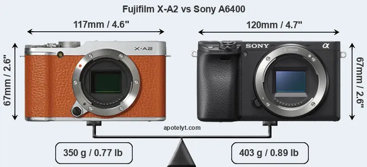 El tamaño físico y el peso de Fujifilm X-A2 y Sony A6400 se ilustran en el siguiente gráfico. Las dos cámaras se muestran según su tamaño relativo. Todas las dimensiones están redondeadas al milímetro más cercano.