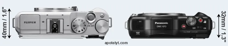 El tamaño físico y el peso de Fujifilm X-A5 y Panasonic GF3 se ilustran en el siguiente gráfico. Las dos cámaras se muestran según su tamaño relativo. Todas las dimensiones están redondeadas al milímetro más cercano.