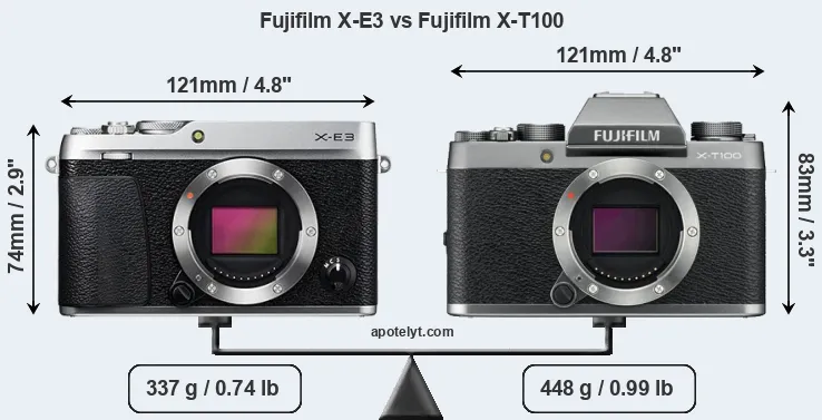 El tamaño físico y el peso de Fujifilm X-E3 y Fujifilm X-T100 se ilustran en el siguiente gráfico. Las dos cámaras se muestran según su tamaño relativo. Todas las dimensiones están redondeadas al milímetro más cercano.