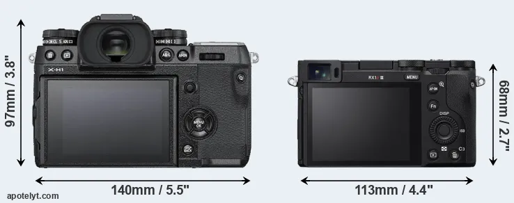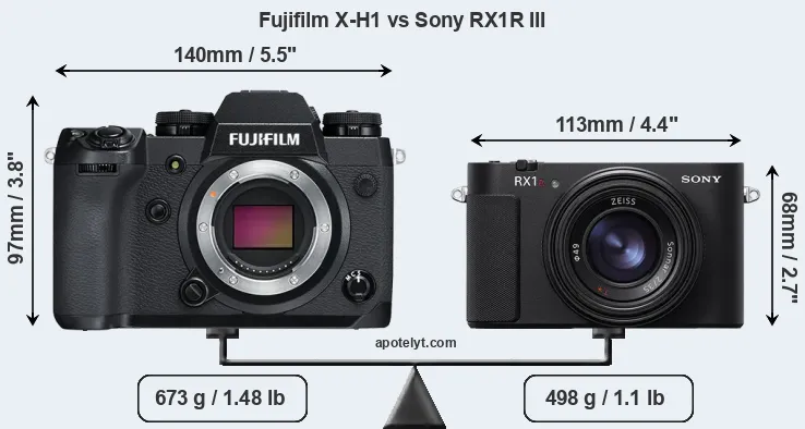 La Fujifilm X-H1 y la Sony Cyber-shot DSC-RX1R III son dos cámaras digitales que fueron reveladas al público, respectivamente, en febrero de 2018 y julio de 2025. La X-H1 es una cámara de objectivos intercambiables sin espejo, mientras que la RX1R III es una cámara compacta con objectivo incorporada. Las cámaras son equipados con un sensor de fotograma APS-C (X-H1) y un sensor de fotograma completo (RX1R III). La Fujifilm tiene una resolución de 24,0 megapíxeles, mientras que la Sony proporciona 60,2 MP.