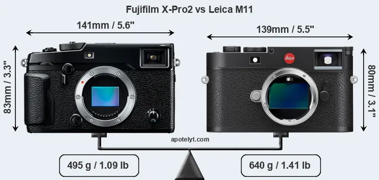 La Fujifilm X-Pro2 y la Leica M11 (Typ 2416) son dos cámaras digitales que fueron reveladas al público, respectivamente, en enero de 2016 y enero de 2022. La X-Pro2 es una cámara de objectivos intercambiables sin espejo, mientras que la M11 es una cámara sin espejo con enfoque de telémetro. Las cámaras son equipados con un sensor de fotograma APS-C (X-Pro2) y un sensor de fotograma completo (M11). La Fujifilm tiene una resolución de 24,0 megapíxeles, mientras que la Leica proporciona 60,3 MP.