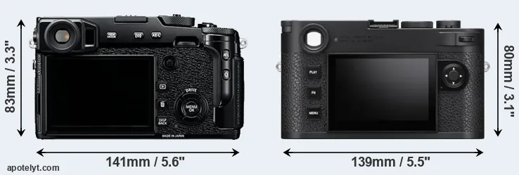 El tamaño físico y el peso de Fujifilm X-Pro2 y Leica M11 se ilustran en el siguiente gráfico. Las dos cámaras se muestran según su tamaño relativo. Todas las dimensiones están redondeadas al milímetro más cercano.