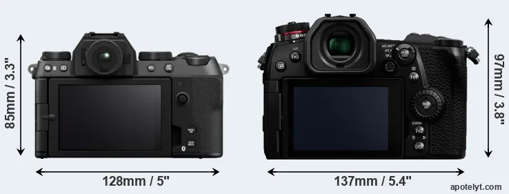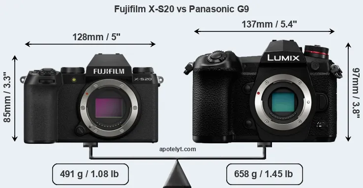 El tamaño físico y el peso de Fujifilm X-S20 y Panasonic G9 se ilustran en el siguiente gráfico. Las dos cámaras se muestran según su tamaño relativo. Todas las dimensiones están redondeadas al milímetro más cercano.