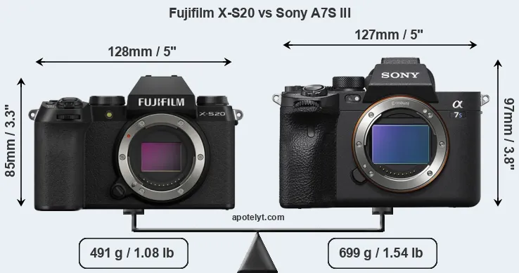 El tamaño físico y el peso de Fujifilm X-S20 y Sony A7S III se ilustran en el siguiente gráfico. Las dos cámaras se muestran según su tamaño relativo. Todas las dimensiones están redondeadas al milímetro más cercano.
