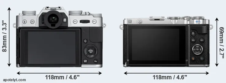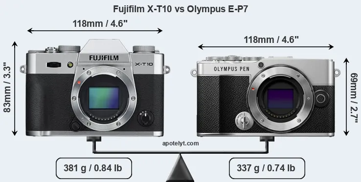 El tamaño físico y el peso de Fujifilm X-T10 y Olympus E-P7 se ilustran en el siguiente gráfico. Las dos cámaras se muestran según su tamaño relativo. Todas las dimensiones están redondeadas al milímetro más cercano.