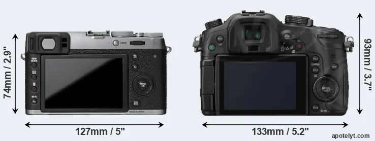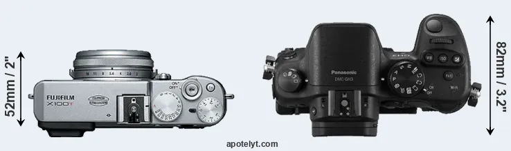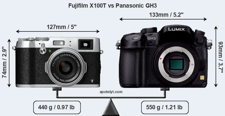 El tamaño físico y el peso de Fujifilm X100T y Panasonic GH3 se ilustran en el siguiente gráfico. Las dos cámaras se muestran según su tamaño relativo. Todas las dimensiones están redondeadas al milímetro más cercano.