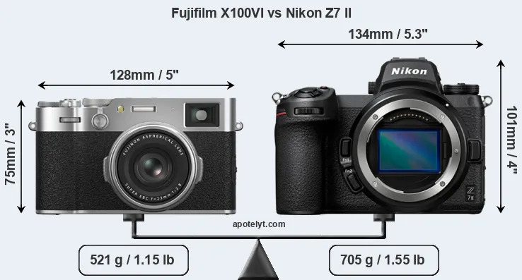 El tamaño físico y el peso de Fujifilm X100VI y Nikon Z7 II se ilustran en el siguiente gráfico. Las dos cámaras se muestran según su tamaño relativo. Todas las dimensiones están redondeadas al milímetro más cercano.