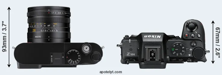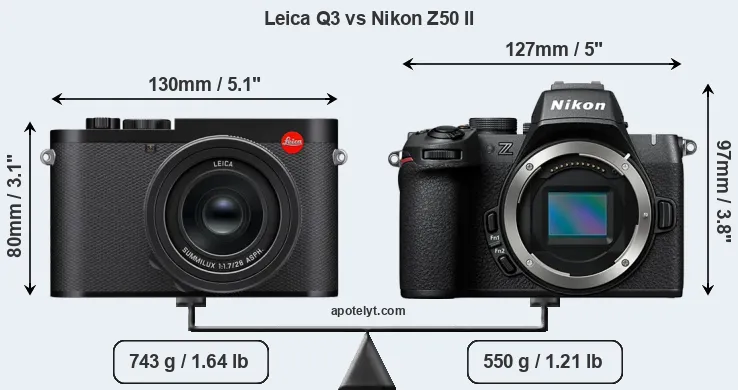 La Leica Q3 y la Nikon Z50 II son dos cámaras digitales que fueron reveladas al público, respectivamente, en mayo de 2023 y noviembre de 2024. La Q3 es una cámara compacta con objectivo incorporada, mientras que la Z50 II es una cámara de objectivos intercambiables sin espejo. Las cámaras son equipados con un sensor de fotograma completo (Q3) y un sensor de fotograma APS-C (Z50 II). La Leica tiene una resolución de 60,3 megapíxeles, mientras que la Nikon proporciona 20,7 MP.