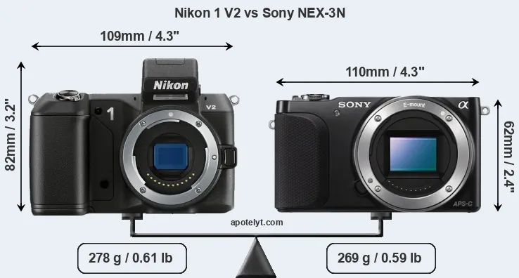 El tamaño físico y el peso de Nikon 1 V2 y Sony NEX-3N se ilustran en el siguiente gráfico. Las dos cámaras se muestran según su tamaño relativo. Todas las dimensiones están redondeadas al milímetro más cercano.