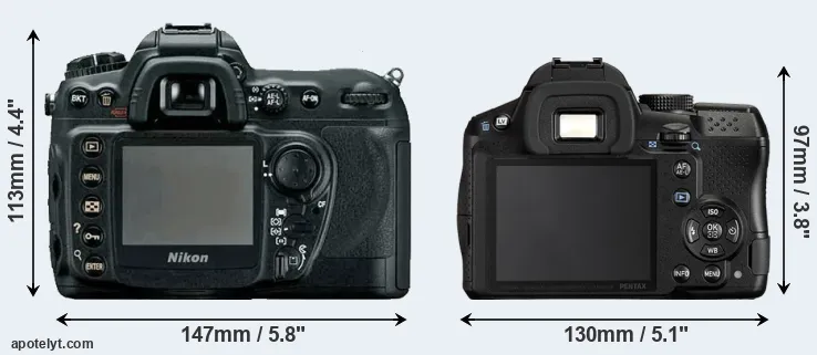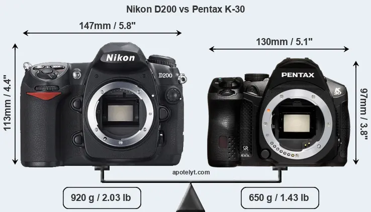 El tamaño físico y el peso de Nikon D200 y Pentax K-30 se ilustran en el siguiente gráfico. Las dos cámaras se muestran según su tamaño relativo. Todas las dimensiones están redondeadas al milímetro más cercano.