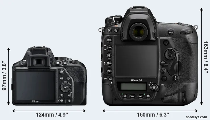 El tamaño físico y el peso de Nikon D3500 y Nikon D6 se ilustran en el siguiente gráfico. Las dos cámaras se muestran según su tamaño relativo. Todas las dimensiones están redondeadas al milímetro más cercano.
