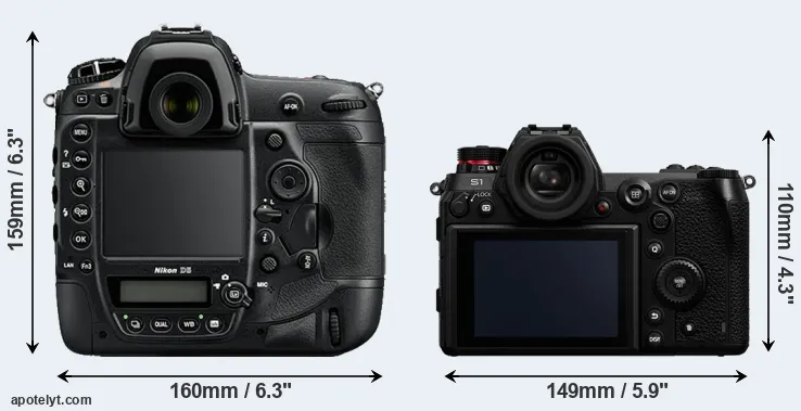 El tamaño físico y el peso de Nikon D5 y Panasonic S1 se ilustran en el siguiente gráfico. Las dos cámaras se muestran según su tamaño relativo. Todas las dimensiones están redondeadas al milímetro más cercano.
