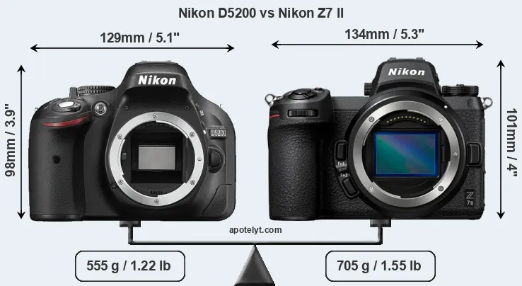 La Nikon D5200 y la Nikon Z7 II son dos cámaras digitales que fueron reveladas al público, respectivamente, en noviembre de 2012 y octubre de 2020. La D5200 es una cámara DSLR, mientras que la Z7 II es una cámara de objectivos intercambiables sin espejo.Las cámaras son equipados con un sensor de fotograma APS-C (D5200) y un sensor de fotograma completo (Z7 II). La D5200 tiene una resolución de 24,0 megapíxeles, mientras que la Z7 II proporciona 45,4 MP.