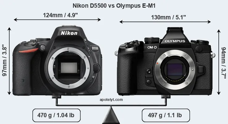 El tamaño físico y el peso de Nikon D5500 y Olympus E-M1 se ilustran en el siguiente gráfico. Las dos cámaras se muestran según su tamaño relativo. Todas las dimensiones están redondeadas al milímetro más cercano.