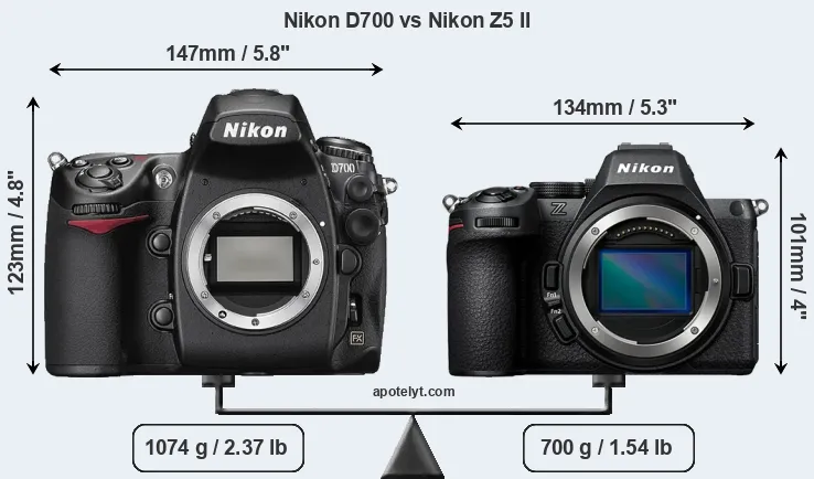 El tamaño físico y el peso de Nikon D700 y Nikon Z5 II se ilustran en el siguiente gráfico. Las dos cámaras se muestran según su tamaño relativo. Todas las dimensiones están redondeadas al milímetro más cercano.