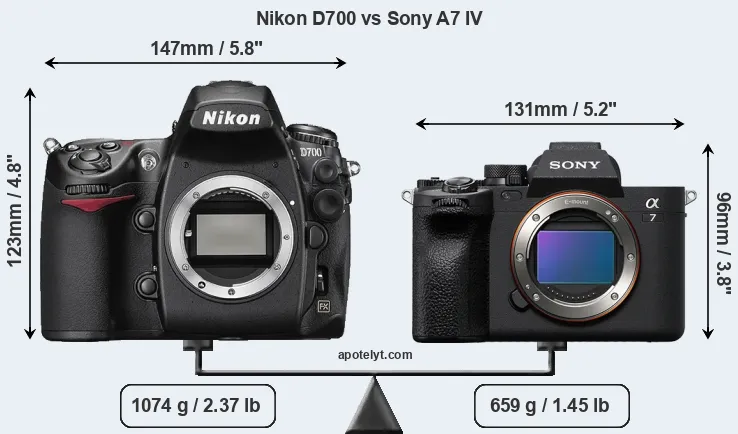 El tamaño físico y el peso de Nikon D700 y Sony A7 IV se ilustran en el siguiente gráfico. Las dos cámaras se muestran según su tamaño relativo. Todas las dimensiones están redondeadas al milímetro más cercano.