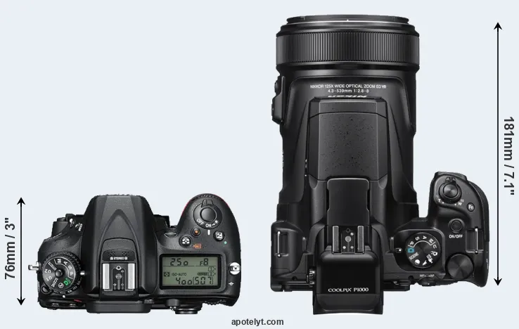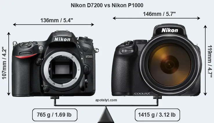 El tamaño físico y el peso de Nikon D7200 y Nikon P1000 se ilustran en el siguiente gráfico. Las dos cámaras se muestran según su tamaño relativo. Todas las dimensiones están redondeadas al milímetro más cercano.