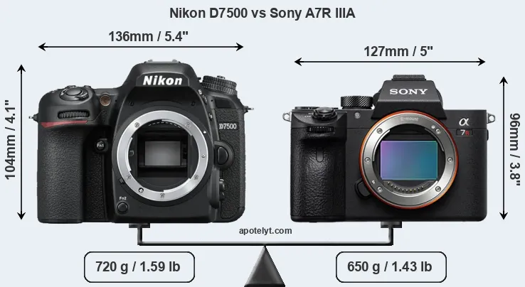 El tamaño físico y el peso de Nikon D7500 y Sony A7R IIIA se ilustran en el siguiente gráfico. Las dos cámaras se muestran según su tamaño relativo. Todas las dimensiones están redondeadas al milímetro más cercano.