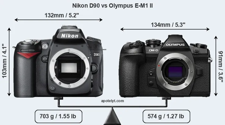 El tamaño físico y el peso de Nikon D90 y Olympus E-M1 II se ilustran en el siguiente gráfico. Las dos cámaras se muestran según su tamaño relativo. Todas las dimensiones están redondeadas al milímetro más cercano.