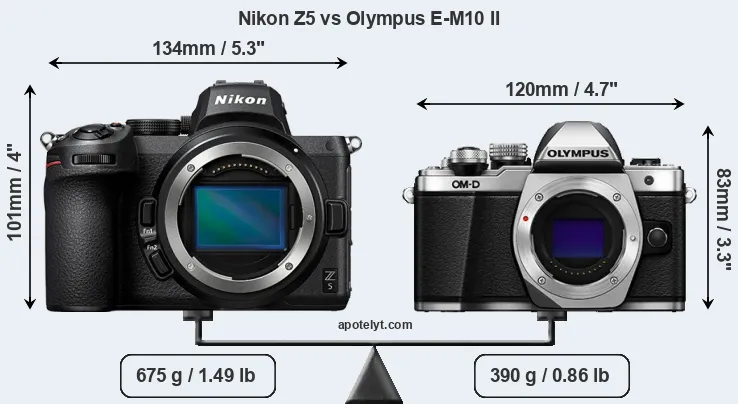 El tamaño físico y el peso de Nikon Z5 y Olympus E-M10 II se ilustran en el siguiente gráfico. Las dos cámaras se muestran según su tamaño relativo. Todas las dimensiones están redondeadas al milímetro más cercano.