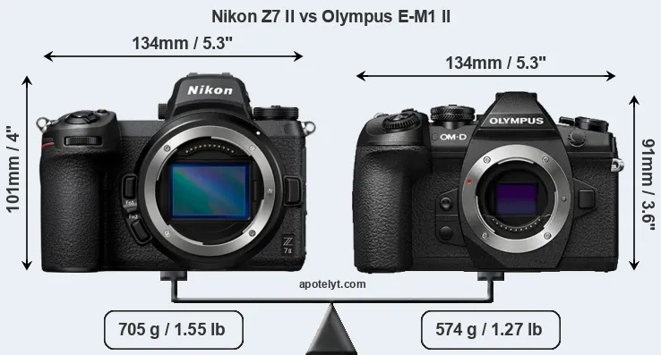 El tamaño físico y el peso de Nikon Z7 II y Olympus E-M1 II se ilustran en el siguiente gráfico. Las dos cámaras se muestran según su tamaño relativo. Todas las dimensiones están redondeadas al milímetro más cercano.
