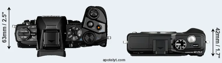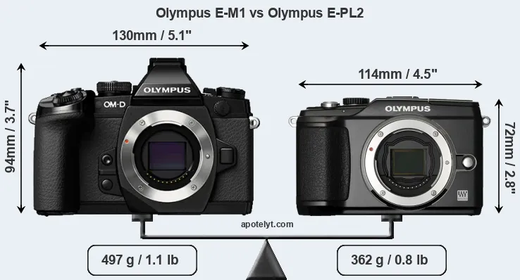 El tamaño físico y el peso de Olympus E-M1 y Olympus E-PL2 se ilustran en el siguiente gráfico. Las dos cámaras se muestran según su tamaño relativo. Todas las dimensiones están redondeadas al milímetro más cercano.