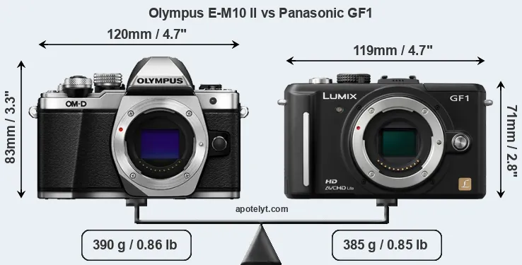 El tamaño físico y el peso de Olympus E-M10 II y Panasonic GF1 se ilustran en el siguiente gráfico. Las dos cámaras se muestran según su tamaño relativo. Todas las dimensiones están redondeadas al milímetro más cercano.
