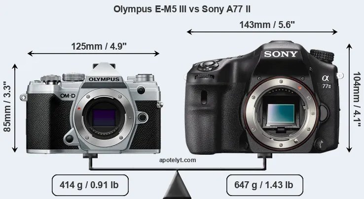 El tamaño físico y el peso de Olympus E-M5 III y Sony A77 II se ilustran en el siguiente gráfico. Las dos cámaras se muestran según su tamaño relativo. Todas las dimensiones están redondeadas al milímetro más cercano.