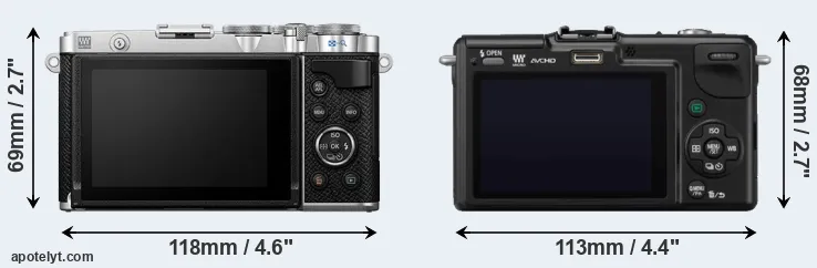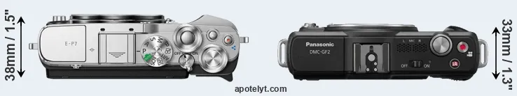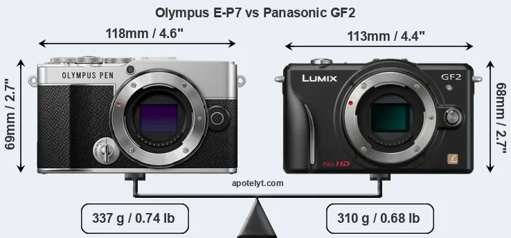 El tamaño físico y el peso de Olympus E-P7 y Panasonic GF2 se ilustran en el siguiente gráfico. Las dos cámaras se muestran según su tamaño relativo. Todas las dimensiones están redondeadas al milímetro más cercano.