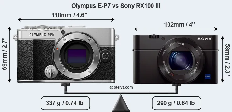 La Olympus PEN E-P7 y la Sony Cyber-shot DSC-RX100 III son dos cámaras digitales que fueron reveladas al público, respectivamente, en junio de 2021 y mayo de 2014. La E-P7 es una cámara de objectivos intercambiables sin espejo, mientras que la RX100 III es una cámara compacta con objectivo incorporada. Las cámaras son equipados con un sensor de cuatro tercios (E-P7) y un sensor de 1 pulgada (RX100 III). La Olympus tiene una resolución de 20,2 megapíxeles, mientras que la Sony proporciona 20,0 MP.