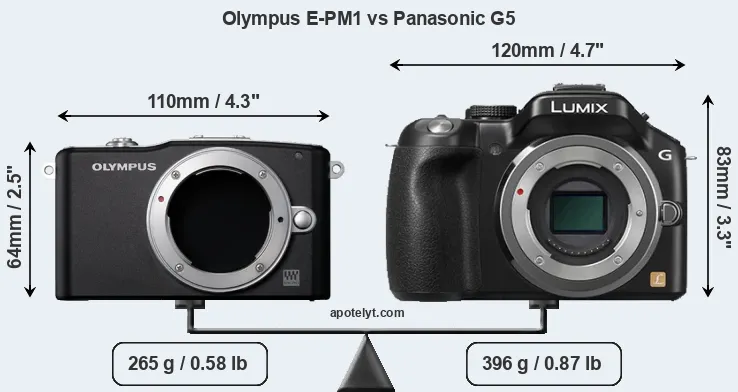 El tamaño físico y el peso de Olympus E-PM1 y Panasonic G5 se ilustran en el siguiente gráfico. Las dos cámaras se muestran según su tamaño relativo. Todas las dimensiones están redondeadas al milímetro más cercano.