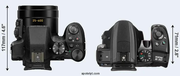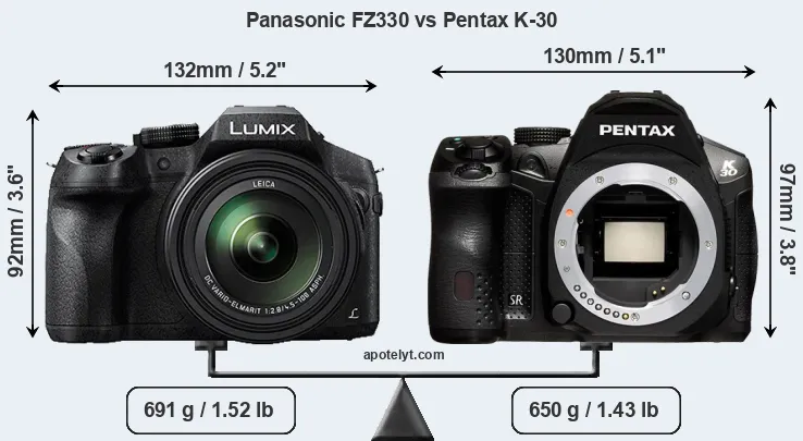 El tamaño físico y el peso de Panasonic FZ330 y Pentax K-30 se ilustran en el siguiente gráfico. Las dos cámaras se muestran según su tamaño relativo. Todas las dimensiones están redondeadas al milímetro más cercano.