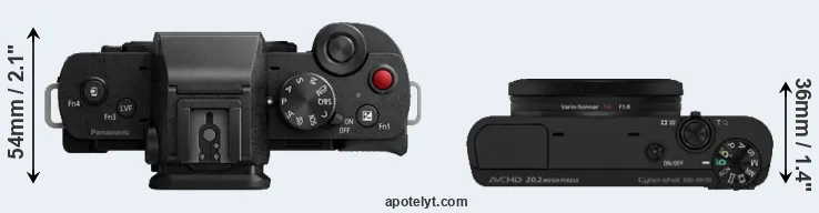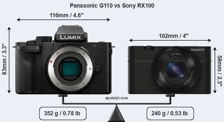 El tamaño físico y el peso de Panasonic G110 y Sony RX100 se ilustran en el siguiente gráfico. Las dos cámaras se muestran según su tamaño relativo. Todas las dimensiones están redondeadas al milímetro más cercano.