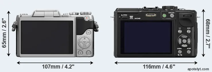 La Panasonic Lumix DMC-GF7 y la Panasonic Lumix DMC-GX1 son dos cámaras digitales que fueron reveladas al público, respectivamente, en enero de 2015 y noviembre de 2011. Ambas son cámaras cámara de objectivos intercambiables sin espejo, que están equipados con un sensor de cuatro tercios. Ambas cámaras ofrecen una resolución de 15,8 megapíxeles.