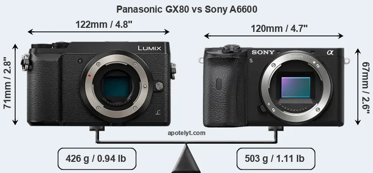 La Panasonic Lumix DMC-GX80 y la Sony Alpha A6600 son dos cámaras digitales que fueron reveladas al público, respectivamente, en abril de 2016 y agosto de 2019. Ambas son cámaras cámara de objectivos intercambiables sin espejo, que están equipados con un sensor de cuatro tercios (GX80) y un sensor de fotograma APS-C (A6600). La Panasonic tiene una resolución de 15,8 megapíxeles, mientras que la Sony proporciona 24,0 MP.