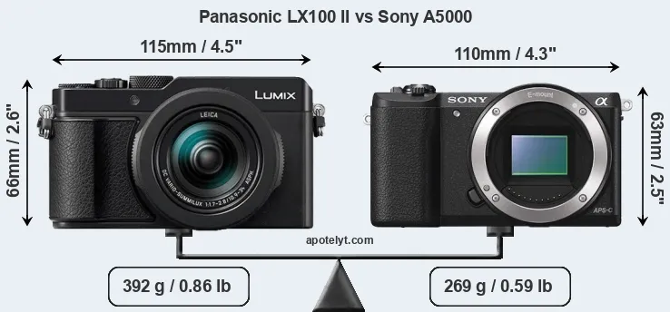 El tamaño físico y el peso de Panasonic LX100 II y Sony A5000 se ilustran en el siguiente gráfico. Las dos cámaras se muestran según su tamaño relativo. Todas las dimensiones están redondeadas al milímetro más cercano.