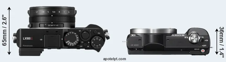 La Panasonic Lumix DC-LX100 II y la Sony Alpha A5000 son dos cámaras digitales que fueron reveladas al público, respectivamente, en agosto de 2018 y enero de 2014. La LX100 II es una cámara compacta con objectivo incorporada, mientras que la A5000 es una cámara de objectivos intercambiables sin espejo. Las cámaras son equipados con un sensor de cuatro tercios (LX100 II) y un sensor de fotograma APS-C (A5000). La Panasonic tiene una resolución de 16,8 megapíxeles, mientras que la Sony proporciona 19,8 MP.