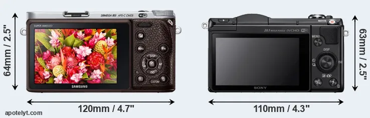 La Samsung NX500 y la Sony Alpha A5000 son dos cámaras digitales que fueron reveladas al público, respectivamente, en febrero de 2015 y enero de 2014. Ambas son cámaras cámara de objectivos intercambiables sin espejo, que están equipados con un sensor de fotograma APS-C. La Samsung tiene una resolución de 28,0 megapíxeles, mientras que la Sony proporciona 19,8 MP.