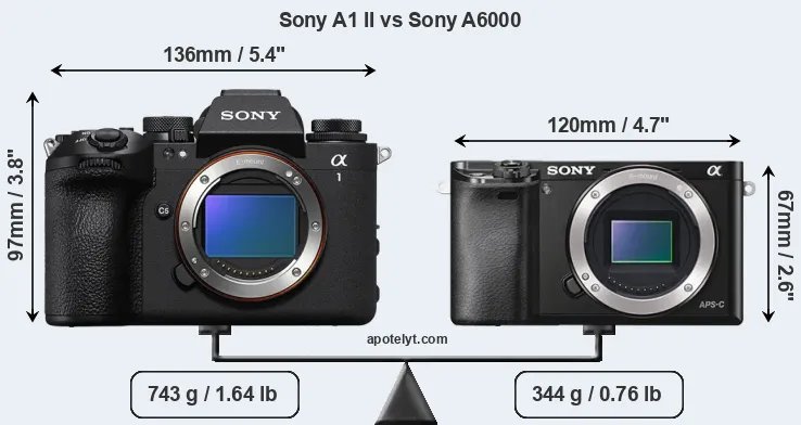 El tamaño físico y el peso de Sony A1 II y Sony A6000 se ilustran en el siguiente gráfico. Las dos cámaras se muestran según su tamaño relativo. Todas las dimensiones están redondeadas al milímetro más cercano.