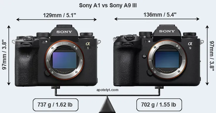 El tamaño físico y el peso de Sony A1 y Sony A9 III se ilustran en el siguiente gráfico. Las dos cámaras se muestran según su tamaño relativo. Todas las dimensiones están redondeadas al milímetro más cercano.