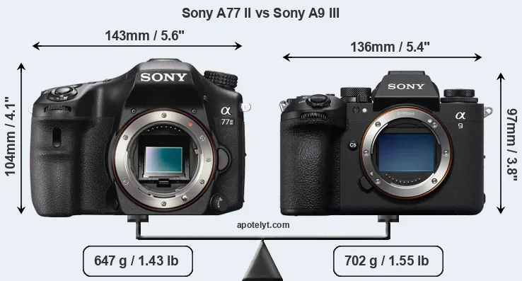 El tamaño físico y el peso de Sony A77 II y Sony A9 III se ilustran en el siguiente gráfico. Las dos cámaras se muestran según su tamaño relativo. Todas las dimensiones están redondeadas al milímetro más cercano.