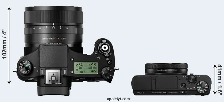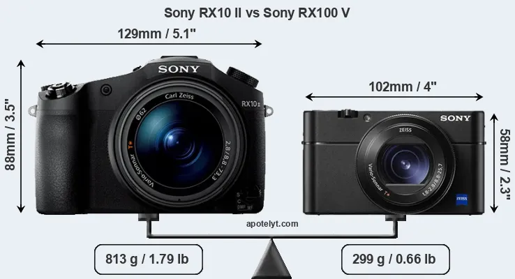 El tamaño físico y el peso de Sony RX10 II y Sony RX100 V se ilustran en el siguiente gráfico. Las dos cámaras se muestran según su tamaño relativo. Todas las dimensiones están redondeadas al milímetro más cercano.