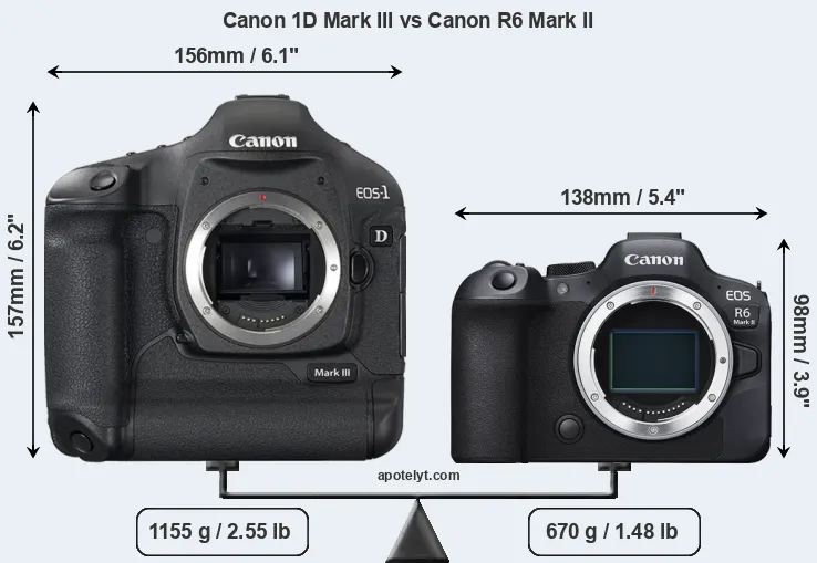 La taille physique et le poids du Canon 1D Mark III et du Canon R6 Mark II sont illustrés dans le graphique ci-dessous. Les deux caméras sont affichées en fonction de leur taille relative. Toutes les dimensions sont arrondies au millimètre près.