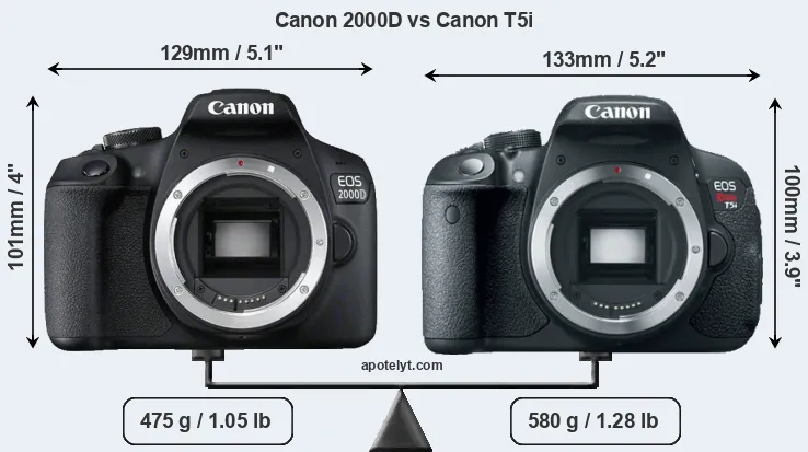 Le Canon EOS 2000D et le Canon EOS Rebel T5i sont deux appareils photo numériques, qui ont été révélés au public, respectivement, en February 2018 et March 2013. Les deux sont des appareils photo reflex numériques (Digital Single Lens Reflex) qui sont équipés d'un capteur APS-C. Le 2000D a une résolution de 24,0 mégapixels, alors que le T5i fournit 17,9 MP.