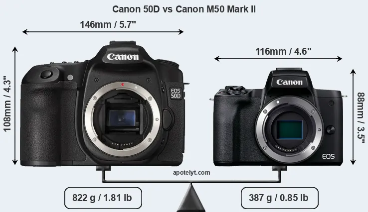 La taille physique et le poids du Canon 50D et du Canon M50 Mark II sont illustrés dans le graphique ci-dessous. Les deux caméras sont affichées en fonction de leur taille relative. Toutes les dimensions sont arrondies au millimètre près.