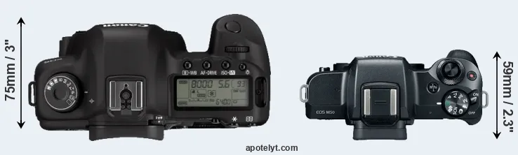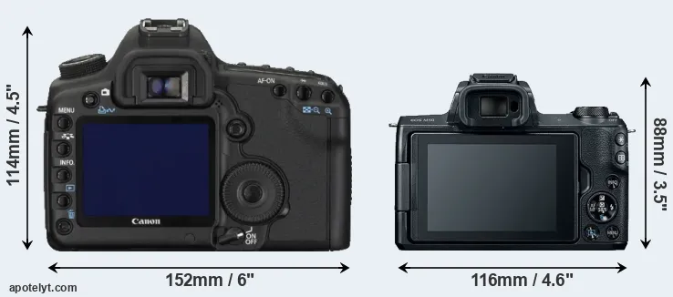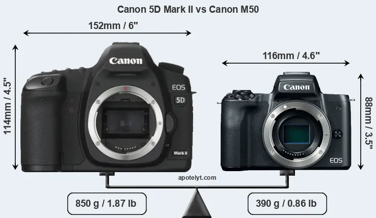 La taille physique et le poids du Canon 5D Mark II et du Canon M50 sont illustrés dans le graphique ci-dessous. Les deux caméras sont affichées en fonction de leur taille relative. Toutes les dimensions sont arrondies au millimètre près.