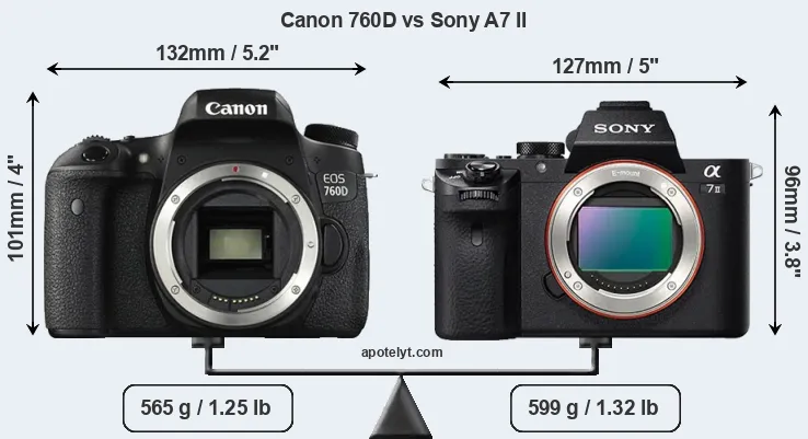 La taille physique et le poids du Canon 760D et du Sony A7 II sont illustrés dans le graphique ci-dessous. Les deux caméras sont affichées en fonction de leur taille relative. Toutes les dimensions sont arrondies au millimètre près.